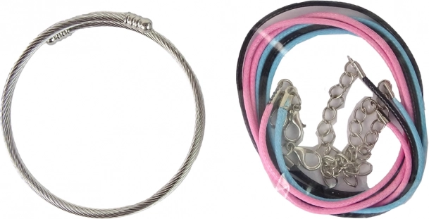 DIY karkötőkészítő készletünk a kreativitás és a szépség tökéletes kombinációja. A lépésről lépésre szóló útmutató segít megérteni a karkötőkészítés technikáit, és rengeteg inspirációt, új mintát ad. A szett változatos kompozíciók létrehozását teszi lehetővé a három színes zsinórnak (rózsaszín, kék és fekete) köszönhetően, 42 cm-es hosszban, valamint a két ezüst láncnak 12 cm-es hosszban.