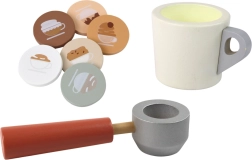 A fa és műanyag minőségi kombinációja tartós és kellemes tapintású. A kávéfőzővel való játék fejleszti a finommotorikát, a szem–kéz koordinációt és a szociális készségeket is közös játék közben. Kompakt méreteinek köszönhetően a kávéfőző könnyen hordozható és elpakolható.