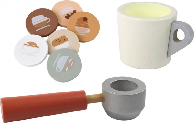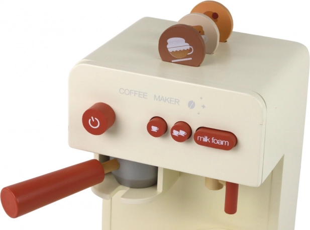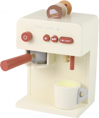 Ez a fa kávéfőző hűen utánozza a valódi készüléket, így a gyerekek igazi baristának érezhetik magukat. A vezérlés magában foglalja a „bekapcsoló” gombot, az egy vagy két csésze választását és a tejhabosítás funkcióját, ami fejleszti a fantáziát és a mindennapi tevékenységek utánzását.