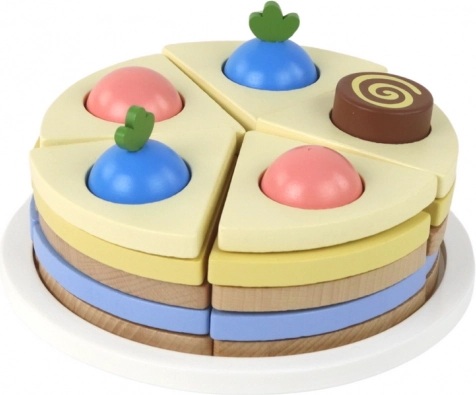 Ez a minőségi, fából készült torta szeletekre van osztva, amelyeket tépőzár köt össze. Így a gyerekek könnyedén „vághatják”, összeállíthatják és tálalhatják az adagokat, miközben gyakorolják a fogást és fejlesztik a fantáziájukat. A színes díszek és elemek felfedezésre ösztönöznek, segítik a színek és formák tanulását.