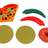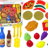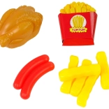 A szett pizzadarabokat, paprikát, hamburgereket és derelyét tartalmaz. Színes és szórakoztató játékok, amelyek ösztönzik a szerepjátékot és az ételkészítés szimulációját.