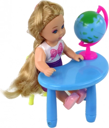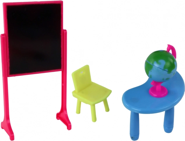 A készlet tartalmaz egy műanyag táblát és egy földgömböt, amelyek támogatják a oktatást és a felfedezést a világban. Ennek köszönhetően hozzájárulnak a gyermek fantáziájának és kreativitásának fejlesztéséhez. A gyerekek ezzel a készlettel különböző iskolai jelenetek és helyzetek előadására használhatják, miközben szórakoznak és tanulnak egyszerre.