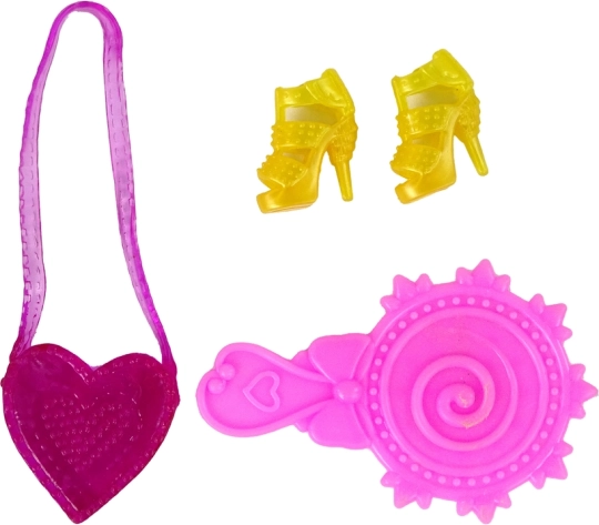 A szett mindent tartalmaz az azonnali játékhoz: ecsetet a ruhák díszítéséhez, a stílushoz illő arany cipőket, rózsaszín fésűt a fésüléshez és egy rózsaszín, szívalakú táskát bájos kiegészítőként. A baba könnyű, tartós és egyszerűen hordozható.