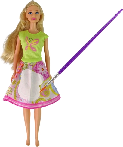 Kreatív baba hosszú, világos hajjal és olyan ruhákkal, amelyeket saját magad díszíthetsz. A csomagban találsz ecsetet, arany színű cipőcskéket, rózsaszín fésűt és szívalakú táskát. Ideális kis divatrajongóknak, akik szeretnek alkotni. Ruhafestés, tartozékok a csomagban és könnyű kezelhetőség a 29 cm-es méretnek köszönhetően.