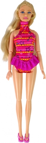 A bábú hosszú szőke hajjal és gyönyörű rózsaszín fürdőruhában van felöltözve, amely támogat mindenfajta játékot.
