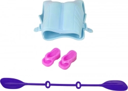 A készlet része a kék mentőmellény, rózsaszín papucs és lila evező a valósághű élményért.