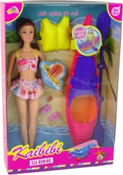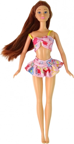 A szett babája stílusos kétrészes strandruhát és hosszú barna hajat visel, ami ideális társsá teszi bármilyen képzeletbeli játékhoz.