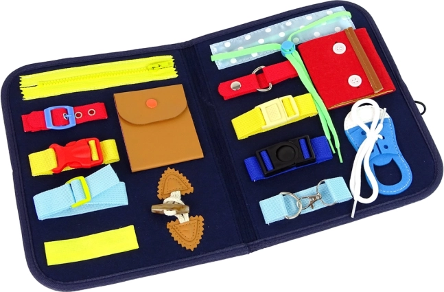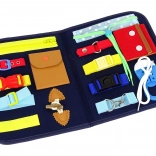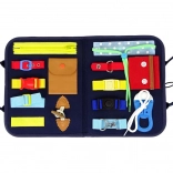 A tábla számos alakban és textúrákban tartalmaz elemeket, amelyek segítenek javítani az érintés érzékelését. Tartalmaz különböző bekapcsolási típusokat, mint például gombokat, csattokat és fűzőket, amely serkenti a gyermek kreativitását és önállóságra nevel a mindennapi feladatok önálló elvégzéséhez.