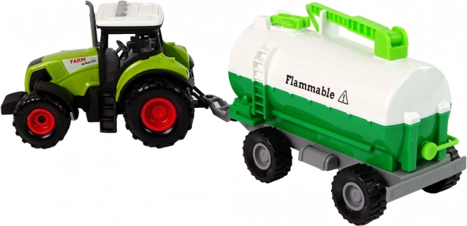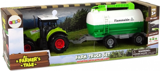 A játék főként zöld színű, amelyet ehhez a járműtípushoz társítunk. A szett egy traktorból és egy tartálykocsiból áll, ami még változatosabbá teszi a játékot. Maga a traktor képes gurulni és jellegzetes hangokat kiadni. A hátsó kerekek kézi meghajtása lehetővé teszi, hogy a jármű előre vagy hátra haladjon, attól függően, mit szeretnétek. A hanghatások tekintetében a traktor tetőjén 3 gomb található. Ezek a gombok olyan hangokat adnak ki, mint a tolatás, a duda és az indítás. A hangok meghallgatásához ki kell húzni a fehér műanyag biztosítékot. A traktorhoz egy tartálykocsis pótkocsi tartozik, amelyet a jármű hátuljához kell csatlakoztatni, ha a gyermek így szeretne játszani. A pótkocsin zöld elemek vannak, amelyeket ki lehet nyitni vagy fel lehet hajtani.