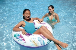 Élvezze a nyarat a 97 cm átmérőjű, két fogantyúval ellátott, friss trópusi megjelenésű felfújható úszógumival. Átmérő 97 cm, 2 masszív fogantyú, max. teherbírás 80 kg és anyagvastagság 0,25 mm – kényelmes és stabil pihenést, valamint szórakozást biztosít a vízben. Válasszon a 2 vonzó minta közül – pálmalevelek vagy flamingók.