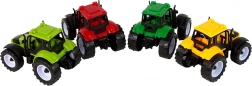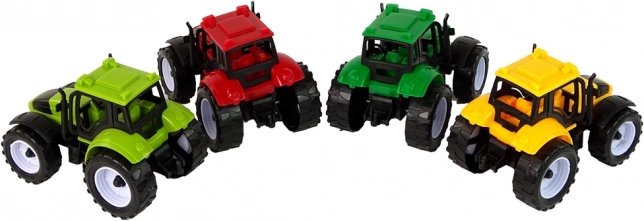 A készlet négy színű traktort tartalmaz: sötétzöld, világoszöld, narancssárga és piros.