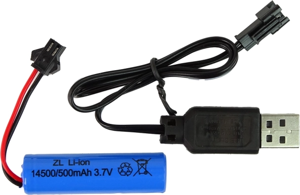 A csomag tartalmaz egy 14500/500mAh 3,7V újratölthető akkumulátort USB kábellel a könnyű újratöltéshez.