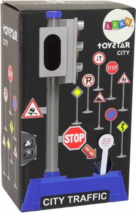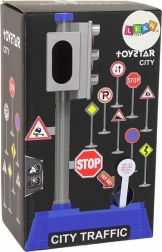 A készletben szürke közlekedési jelzőlámpákat talál 13 cm x 9 cm x 23 cm méretben. Ezek a lámpák nemcsak vizuálisan valósághűek, hanem működnek is – két darab 2x1,5 V R6 AA elemmel üzemelnek, amelyek a készlet részét képezik. A jelzőlámpák hangot adnak ki, amely a valódi kereszteződések lámpáinak hangjára emlékeztet. Bekapcsolás után felváltva világít a piros az autóknak és a zöld a gyalogosoknak, majd fordítva, pont úgy, mint a valóságban. Két táblával vannak díszítve: STOP tábla és előírás egyenesen vagy jobbra haladásra. Az alaplapon, amelyen a lámpák állnak, gyalogátkelő is fel van festve, ami gyakorlati tanulási elemet nyújt.