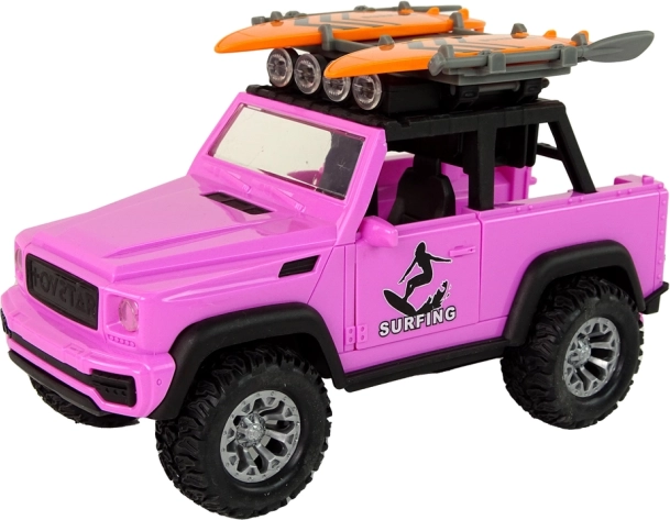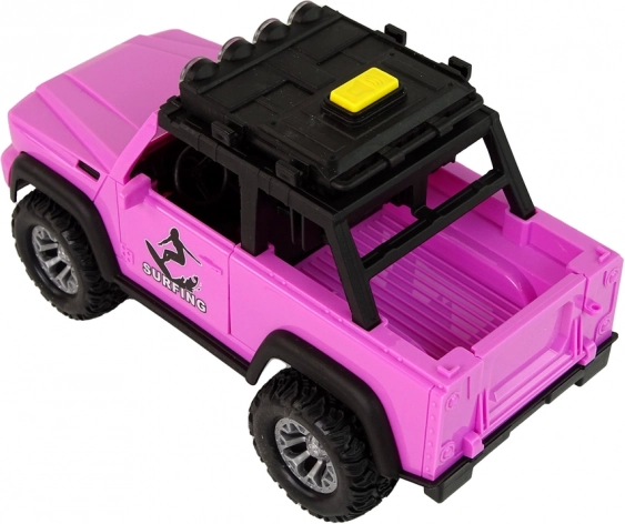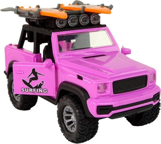 Élvezd a nyári hangulatot a rózsaszín off-road autóval szörf témában. A valósághű részletek, a nagy kerekek és a lendkerekes meghajtás sima haladást biztosítanak, míg a fények és hangok minden utat kalanddá tesznek. A tetőcsomagtartón elhelyezett szörfdeszkák és evezők serkentik a fantáziát és tengerparti történetekre hívnak.