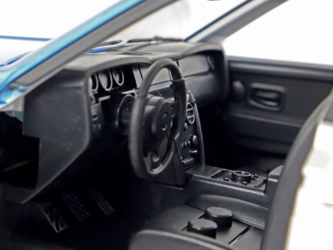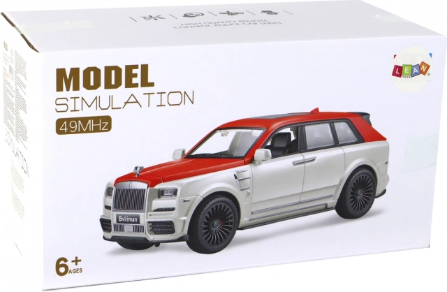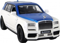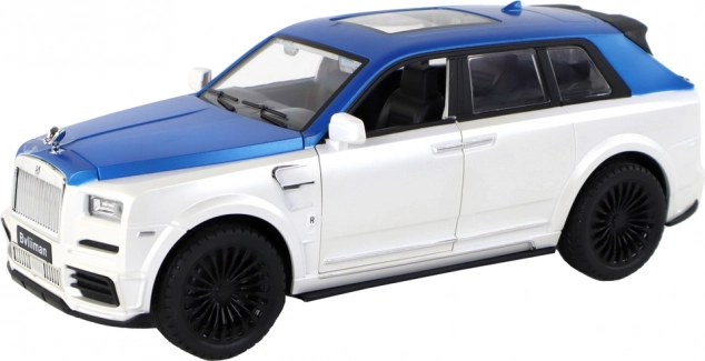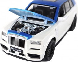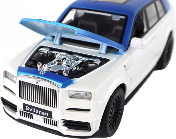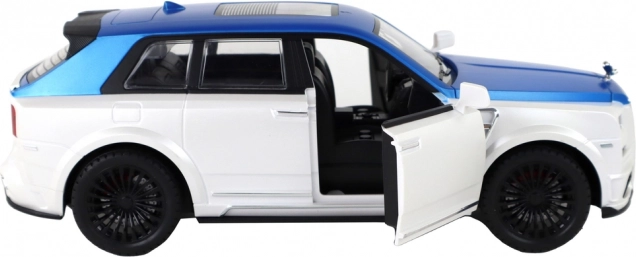 A fehér-kék karosszéria ezüst részletekkel és működő ajtókkal autentikus megjelenést kölcsönöz, akárcsak egy valódi SUV.