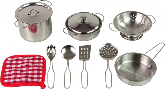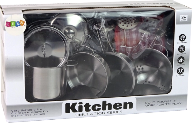 A fém fazék- és konyhai kiegészítő készlet a főzés iránt lelkes kis rajongóknak készült. Hófehér és ezüst kiegészítők valósághű megjelenést biztosítanak, és elősegítik a gyermekek képzeletének és kulináris készségeinek fejlődését.