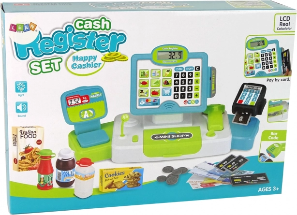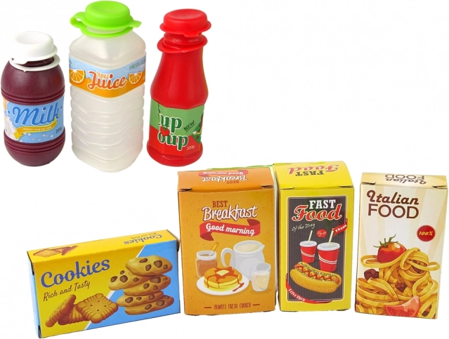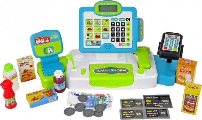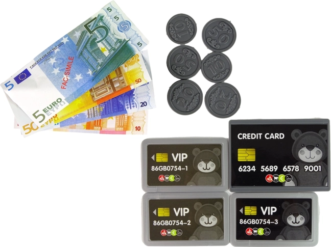 A készlet pénzt, kártyákat és különféle termékeket is tartalmaz, amelyek lehetővé teszik a gyerekeknek a vásárlás szimulálását és a matematikai képességek fejlesztését.