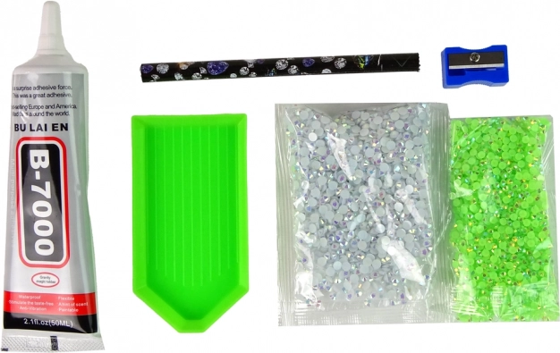 A szett minden szükséges eszközt és kristályokat tartalmaz saját gyémántművészet létrehozásához.