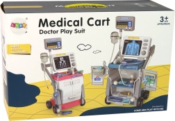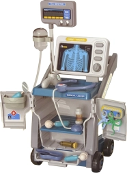 Ez a vonzó orvosi szett fehér–rózsaszín kivitelben minden kis orvosrajongót elbűvöl. A csomag része a guruló állomás, működő elemes sztetoszkóp (3×1,5 V, nem tartozék), fecskendő, olló és további nélkülözhetetlen eszközök. A dekoratív matricák autentikus megjelenést kölcsönöznek az állomásnak.