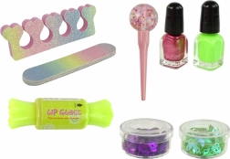 Ez a gyönyörű kozmetikai szett számos vonzó elemet tartalmaz, amely minden fiatal stílus rajongót elvarázsol. A kozmetikai elválasztó segíti a körömfestéket, míg a két ajakfény varázslatot és csillogást kölcsönöz. A körömreszelő és három körömlakk, amelyek közül kettő csillogó, egy pedig tiszta színű, lehetővé teszik a körmök kreatív díszítését különféle mintákkal.