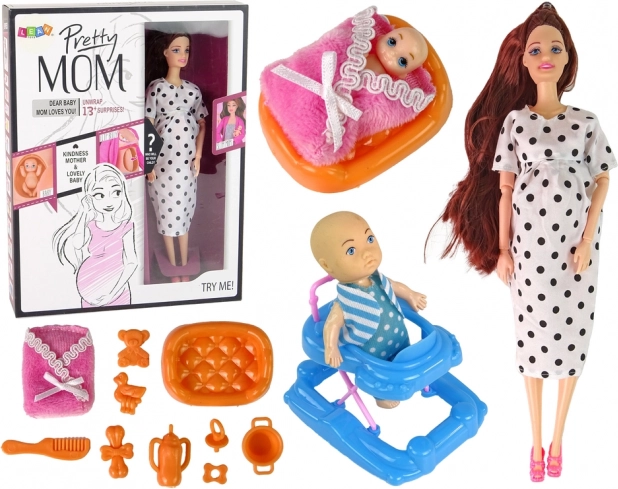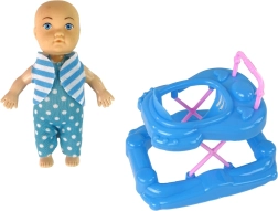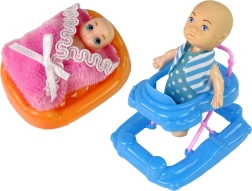 A készlet része egy második baba is - egy kisfiú, aki kék-fehér ruhában, kék szemekkel gazdagítja a játékélményt. Különféle kiegészítők, mint a fésű, készlet, cumi, üveg és járóka zárják a csomagot a teljes és érdekes játék érdekében.