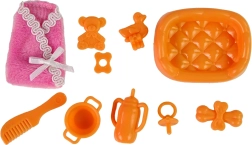 A készlet különféle kiegészítőket tartalmaz, mint például fésű, fürdőkacsa és babás üvegcse, melyek növelik a játék lehetőséget.