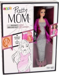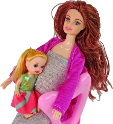 Terhess baba csodálatos kiegészítőkkel, ideális olyan gyermekek számára, akik szeretnek szülőt játszani! A baba hosszú barna hajjal, kék szemekkel rendelkezik és szürke ruhát visel rózsaszín pulóverrel és rózsaszín cipővel.