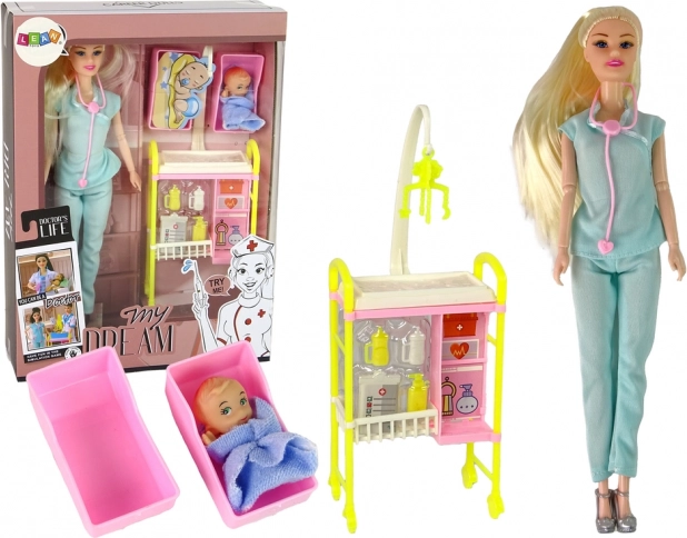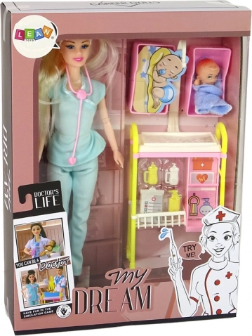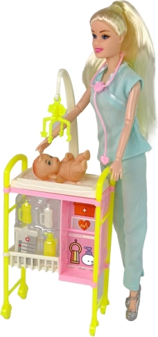 Készülj fel az orvostudomány lenyűgöző világára ezzel a kivételes babával. Tipikus orvosi öltözékbe bújtatva, hosszú szőke hajjal, hiteles légkört teremt minden játékhoz. Rózsaszín sztetoszkóp növeli a hitelességet, míg a mellékelt kiegészítők, mint a baba vagy az orvosi kocsi, támogatják a kreatív játékot.