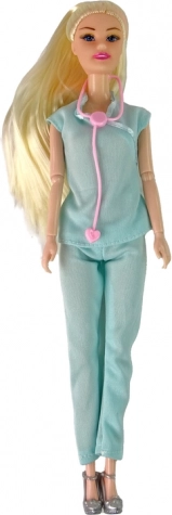 Az elegáns orvosi öltözet és a hosszú, szőke haj autentikus megjelenést kölcsönöz a babának, amely elbűvöli a gyerekeket.