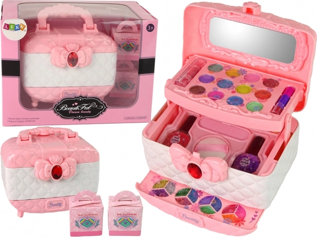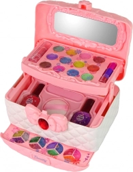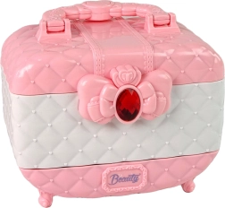Ez az elegáns, masnis bőrönd mindent rejt, ami a biztonságos gyerek sminkeléshez és egy kreatív szépségszalon‑játékhoz szükséges. A három, jól átlátható fióknak köszönhetően a kiegészítők mindig kéznél vannak, a fedélben lévő tükör pedig segít a végső megjelenésben. Kompakt méret: 16 × 18 × 10 cm, így könnyen magával vihető látogatásokra és nyaralásra.
