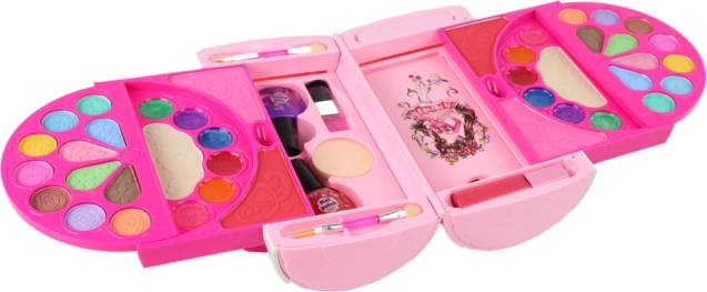 - kozmetikai táska/bőrönd, 22 szemhéjpúder, 12 csillogó árnyalat, 2 púder, 4 pirosító, rúzs, ajakfény, sminkecsetek, szivacs, 2 körömlakk, körömreszelő, 4 applikátor, 2 hajgumi, 2 meglepetésdoboz