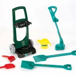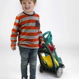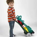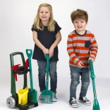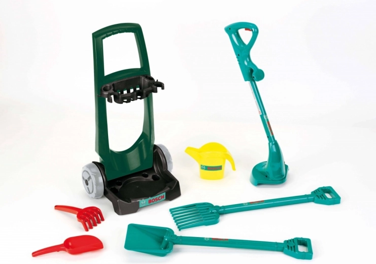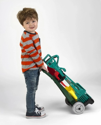Elpusztíthatatlan készlet kis szabadtéri és kertészkedést kedvelő rajongóknak. A kerti kocsi kiváló minőségű műanyagból készült, sötétzöld színű, két nagy, mozgatható kerékkel rendelkezik, továbbá fel van szerelve egy fekete kosárral a kisebb kerti tartozékok számára és egy fekete, stabil alapzattal, amelyen a kerti kellékek a kényelmes fogantyú segítségével szállíthatók. A kerti kocsi a Bosch márka kedvelt dizájnjának replikája. A kocsi tartozékai közé tartozik egy masszív zöld lapát és gereblye jó minőségű műanyagból, továbbá egy sárga locsolókanna, egy piros kerti lapát és egy homokgereblye. Különösen kedvelt a zöld fűszegélynyíró, amely a kerék forgásakor remek csörgő hangot ad. A kertészkedésben való részvétel a gyerekek számára nemcsak szórakoztató, hanem fejleszti a finommotorikát, a térbeli gondolkodást, és egészséges mozgást biztosít a friss levegőn.