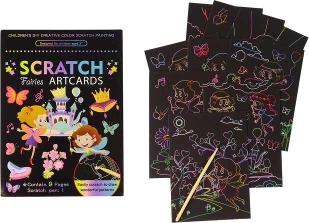 A tündérmotívumos kapargatós színezők órákra lekötik a gyerekeket. Elég finoman lekaparni a fekete réteget, és a varázslatos jelenetek azonnal életre kelnek színekben. A szett praktikus csomagolású, utazáshoz és ajándéknak is remek.