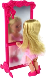 Elegáns balerina anyuka rózsaszín jelmezben, csillogó részletekkel és tüllszoknyával tanítja kislányának az első piruetteket. Mindkét baba rózsaszín balettcipőt visel, hosszú, szőke hajuk pedig táncórához van feltűzve. A nagy, rózsaszín, díszes tükör varázslatos színpadot teremt a mindennapi gyakorláshoz és a nagy előadásokhoz.