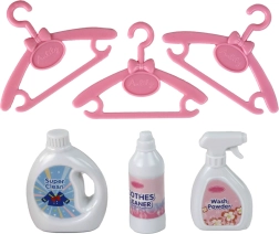 3 ruha, 3 vállfa és 3 „mosószeres” flakon, kiegészítve egy szennyeskosárral – minden adott a teljes otthoni játékélményhez.