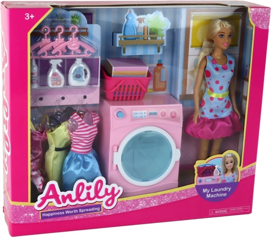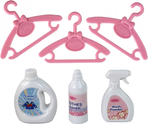 - ANLILY baba, mosógép, szennyeskosár, 3 vállfa, 3 ruha, 3 „mosószeres” flakon, egyedi csomagolás