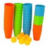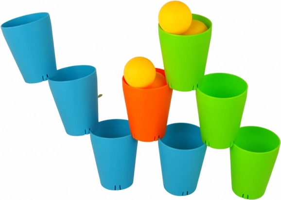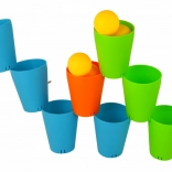 A készlet három színű poharakat tartalmaz: narancssárga, zöld és kék, sárga labdákkal a játékos elrendezéshez és halmozáshoz.