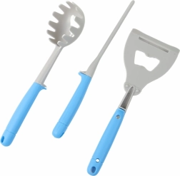 A készlet tartalmaz eszközöket, mint a tésztaszedő kanál, hámozó és késélező, amelyek lehetővé teszik a konyhai előkészítés teljes szimulációját.