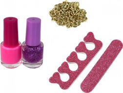 Két élénk színű körömlakk, ujj-szétválasztó és körömreszelő alkotják a mini szalont a kis parádésok számára. Egyszerű és szórakoztató körömdíszítés bármikor.