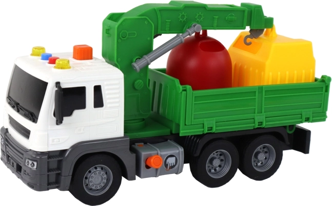 A tetőn található interaktív daru az narancssárga gomb megnyomásával emelhető, így a gyerekek konténereket rakodhatnak fel és le. A csomag 2 színes kukát és 4 hulladéktípus-kártyát tartalmaz, amelyek játékos módon tanítják a újrahasznosítás és ökológia alapelveit. Kompakt mérete ideális otthoni és szabadtéri játékhoz egyaránt.