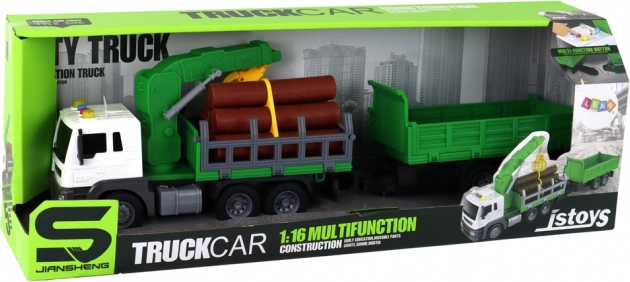 - Komplett szett – kamion, utánfutó és műanyag „rönkök” a csomagban.