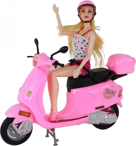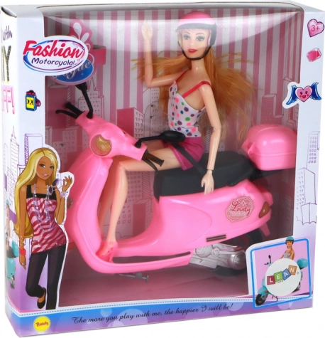 Aranyos baba rózsaszín robogón, amely órákig tartó kreatív szórakozást nyújt. Hosszú szőke haja van, levehető rózsaszín sisakkal és mozgatható karokkal és lábakkal. A rózsaszín robogó forgatható kormánnyal és gördülő kerekekkel támogatja a fantáziadús játékot, a baba rögzítésének köszönhetően pedig biztonságos a „vezetés”. 3 éves kortól ajánlott, CE tanúsítvány és megfelel az EN71 szabványnak.