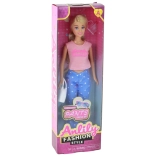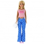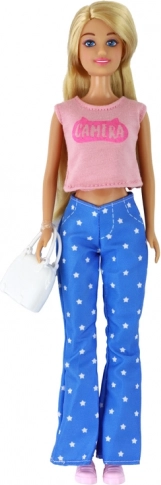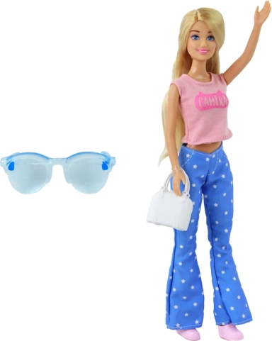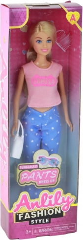 Stílusos ANLILY baba hosszú szőke hajjal, rózsaszín toppal, kék csillagmintás nadrággal és rózsaszín sportcipővel. A csomag része egy fehér kézitáska és egy kék szemüveg a kreatív stylinghoz. Baba mérete: 30 × 7 × 5 cm, csomagolás: 32 × 11 × 5 cm. CE tanúsítvány, EN71 szabvány, 3 éves kortól ajánlott.