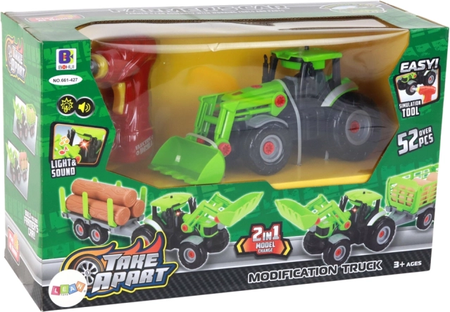 Szórakoztató és oktató készlet kis barkácsolóknak: utánfutós traktor, amelyet a gyerekek maguk szerelhetnek össze és szedhetnek szét. A csomag része egy gyerek fúrógép/csavarhúzó. A játék valósághű motorhangokat és fényhatásokat kínál, fejleszti a finommotorikát, a kreativitást és a logikus gondolkodást.