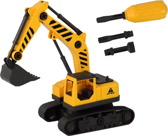 Vontató teherautó (sárga), lánctalpas markoló, csavarhúzó, 3× AG13 elem, útmutató