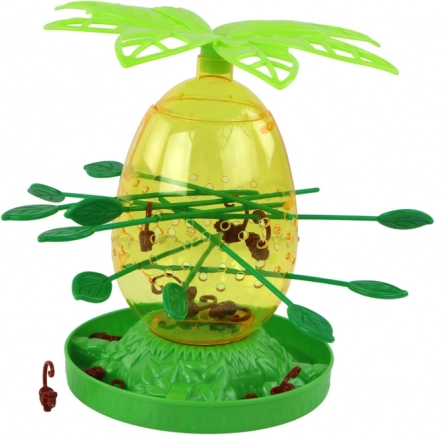 Állítsd össze az átlátszó törzset, fűzd át a zöld „ágacskákat”, szórd be a majmokat, majd zárd le a koronát. A játékosok felváltva, óvatosan húzzák ki a pálcikákat. Minden leeső majom pontnak számít. Az nyer, akinek a legkevesebb majma esik le.