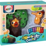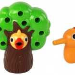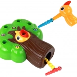 A csomag tartalma: lyukakkal ellátott fa, mágneses madárka a kukacok kihúzásához, színes kukacok és fióka/fészek „etetéshez”.
