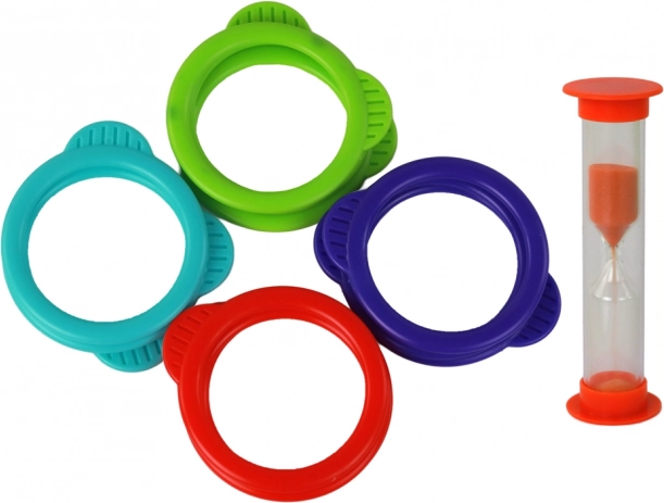 A szett négy színű karikákat és egy homokórát tartalmaz gyors versenykörökhöz. Állítsátok be az időt, és próbáljatok minél több karikát feldobni, mielőtt lepereg a homok.