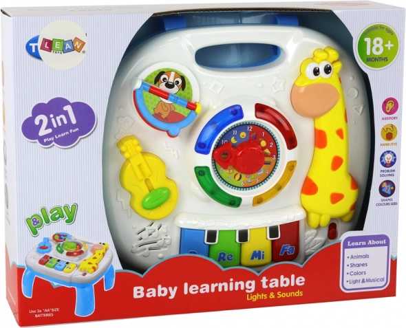 Ez a színes oktató asztalka a levehető lábaknak köszönhetően ötvözi a játéktábla és az önálló asztalka funkcióját. A gyerekeket lenyűgözi a mozgó számlap mutatóval, amely segít az idő felismerésében, valamint a számos interaktív elem – a hangokat adó kis zongorától a szórakoztató kapcsolókon, forgó elemeken át az állatkákat bemutató mini könyvecskéig.