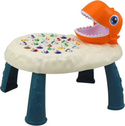 Az vidám dinoszauruszos asztal izgalmas versennyé varázsolja a horgászatot. A narancssárga dinoszaurusz nyitható szája célt szolgál, ahová a játékosok beleteszik a kifogott halacskákat. Játék közben a gyerekek pontosságot, koncentrációt és egészséges versenyszellemet fejlesztenek, miközben rengeteg mókában van részük.